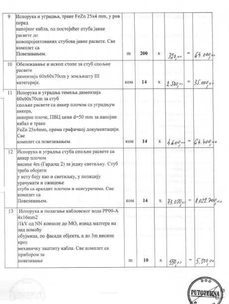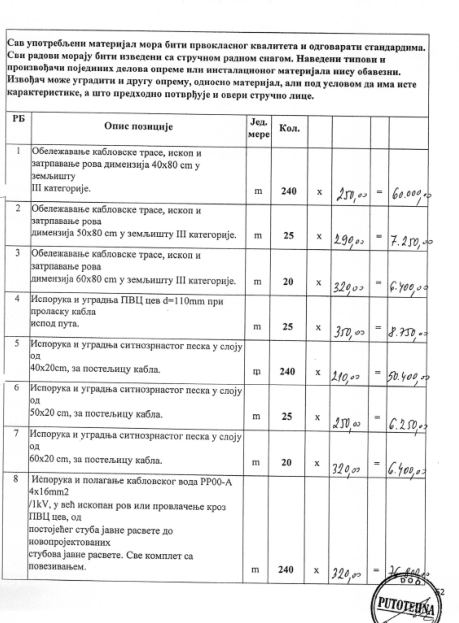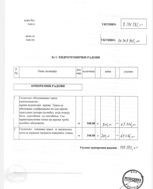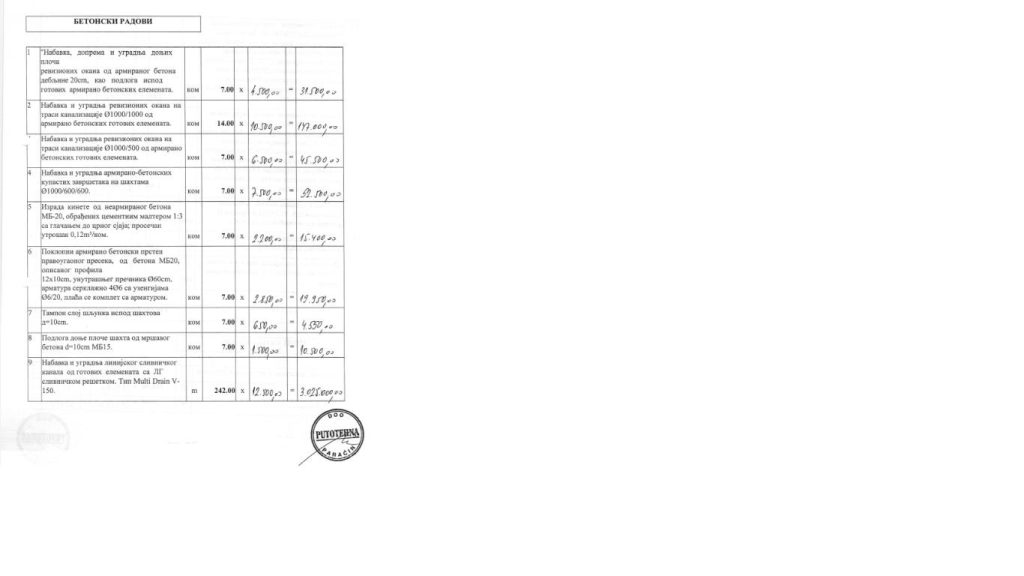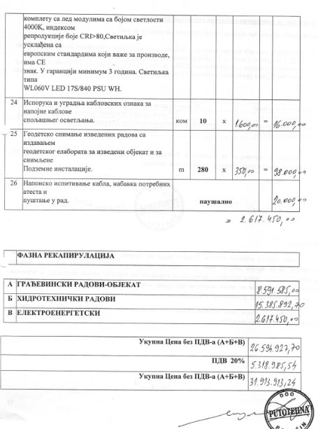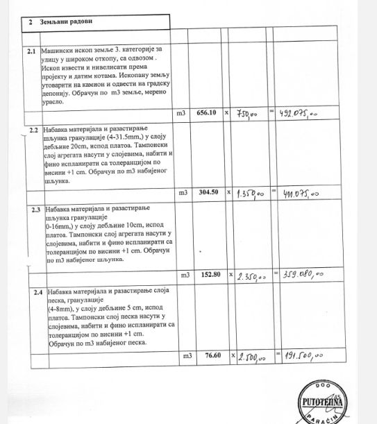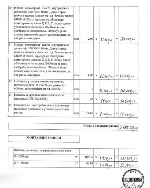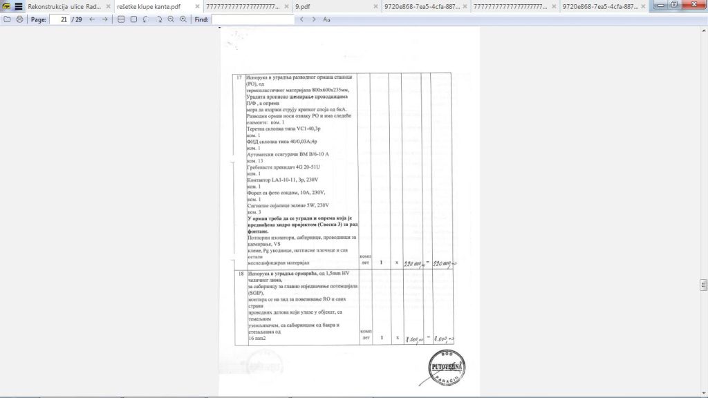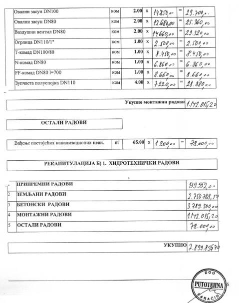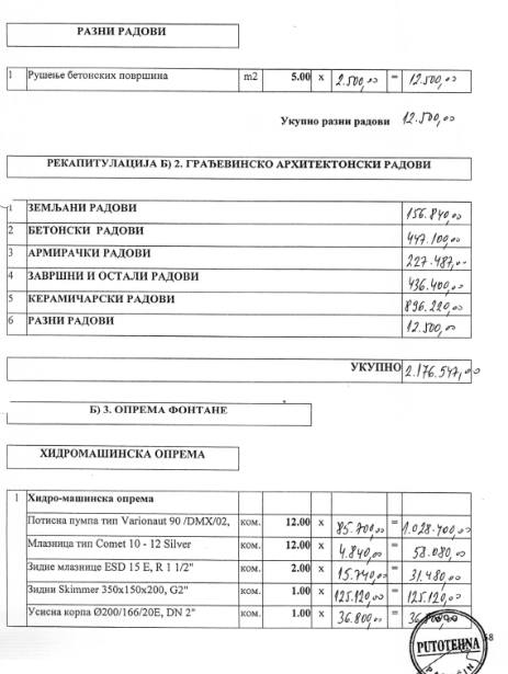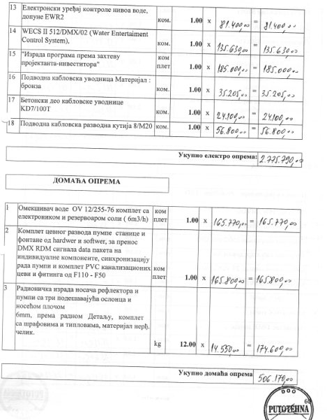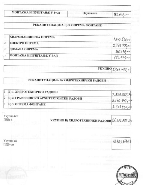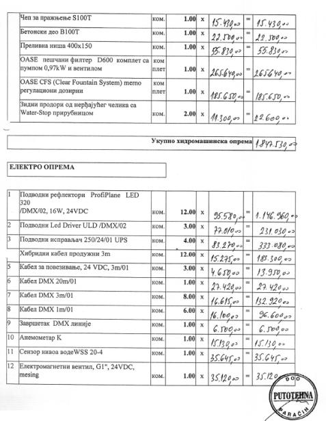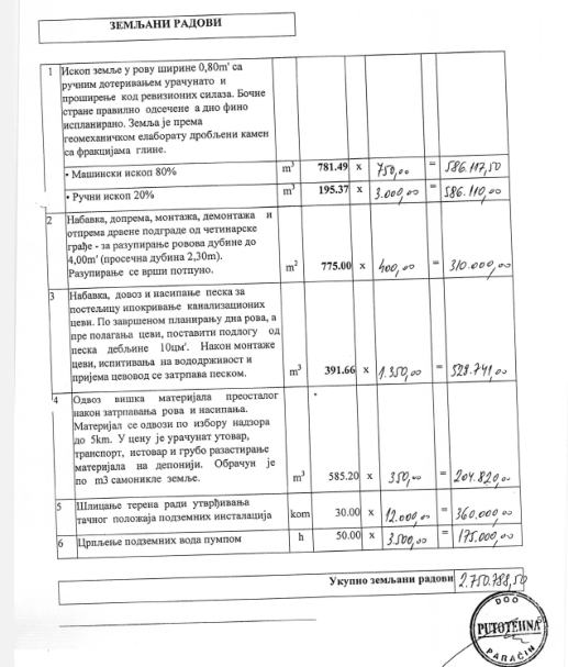 – crpljenje podzemnih voda plaćeno 175.000 dinara (50 sati se crpla voda, 3.500 dinara po satu)