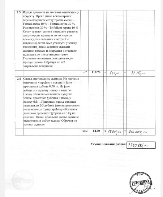 – sadnja trave na 118m2, malo više od 1ar, plaćena 77.155 dinara