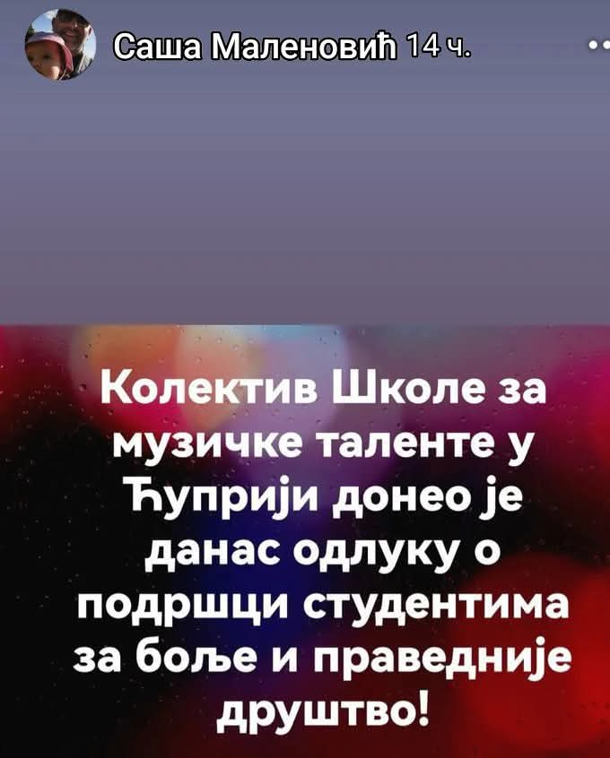 Danas je i kolektiv Škole za muzičke talente doneo odluku da se javno stavi uz studente i njihove zahteve, šaljući poruku da je obrazovanje temelj društva, ali i da prosvetni radnici prepoznaju važnost borbe za promene.