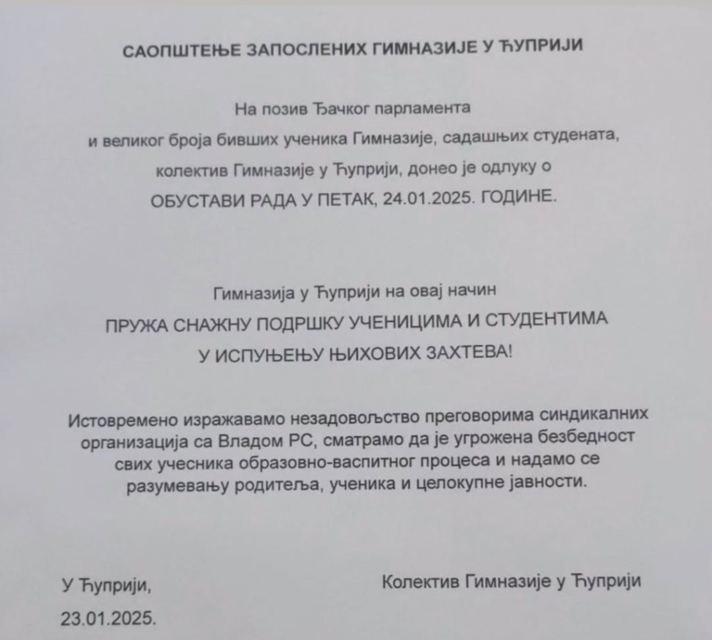 Ovo nije samo okupljanje. Ovo je trenutak kada Ćuprija, mali grad u srcu Srbije, postaje simbol nečeg mnogo većeg. Gimnazija Ćuprije odlučila je da stane uz svoje učenike i pruži podršku njihovim zahtevima. Osnovna škola „Đura Jakšić“ i muzička škola „Dušan Skovran“ pridružiće se protestu, gradeći mostove solidarnosti među generacijama. Ovo nije običan čin – ovo je manifestacija duha zajedništva, trenutak kada razlike među nama blede, a pravda postaje jedini cilj.