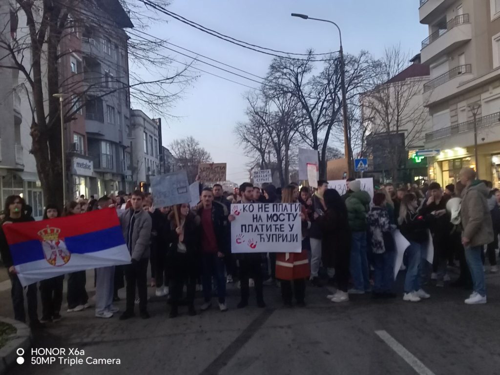 U Ćupriji je danas održan najveći skup u poslednjih petnaest godina, okupivši gotovo 400 građana, među kojima su bili đaci, studenti i građani. Protest je počeo na glavnom trgu obraćanjem studenata okupljenim građanima, zatim su okupljeni građani sa 15 minuta ćutanja odali poštu za 15 žrtava u Novom Sadu. Potom su okupljeni mirno prošetali preko Mikićevog mosta do raskrsnice kod Kvarta.
