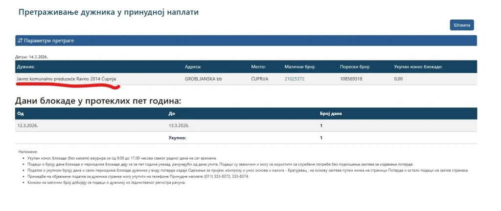 Podaci o prinudnoj naplati pokazuju da je račun preduzeća bio blokiran.